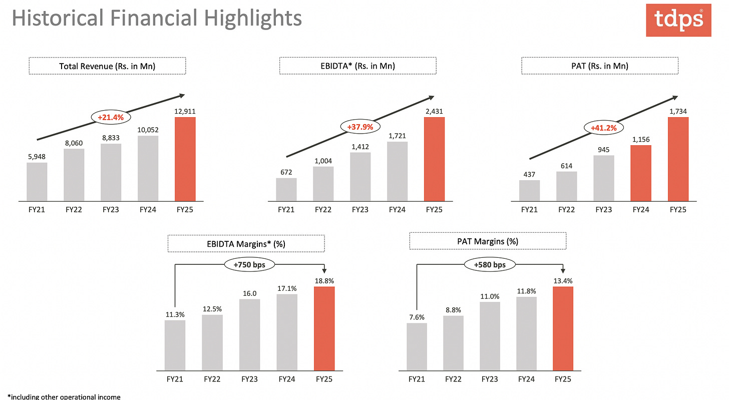 Its EBITDA margins are now north of 20 percent, with return ratios in the mid-20s. In a sector where volatility is the norm and working capital cycles stretch endlessly, TDPS has maintained a near-debt-free balance sheet and cash reserves upwards of Rs 230 crore. That’s not just prudent; that’s masterful capital allocation.