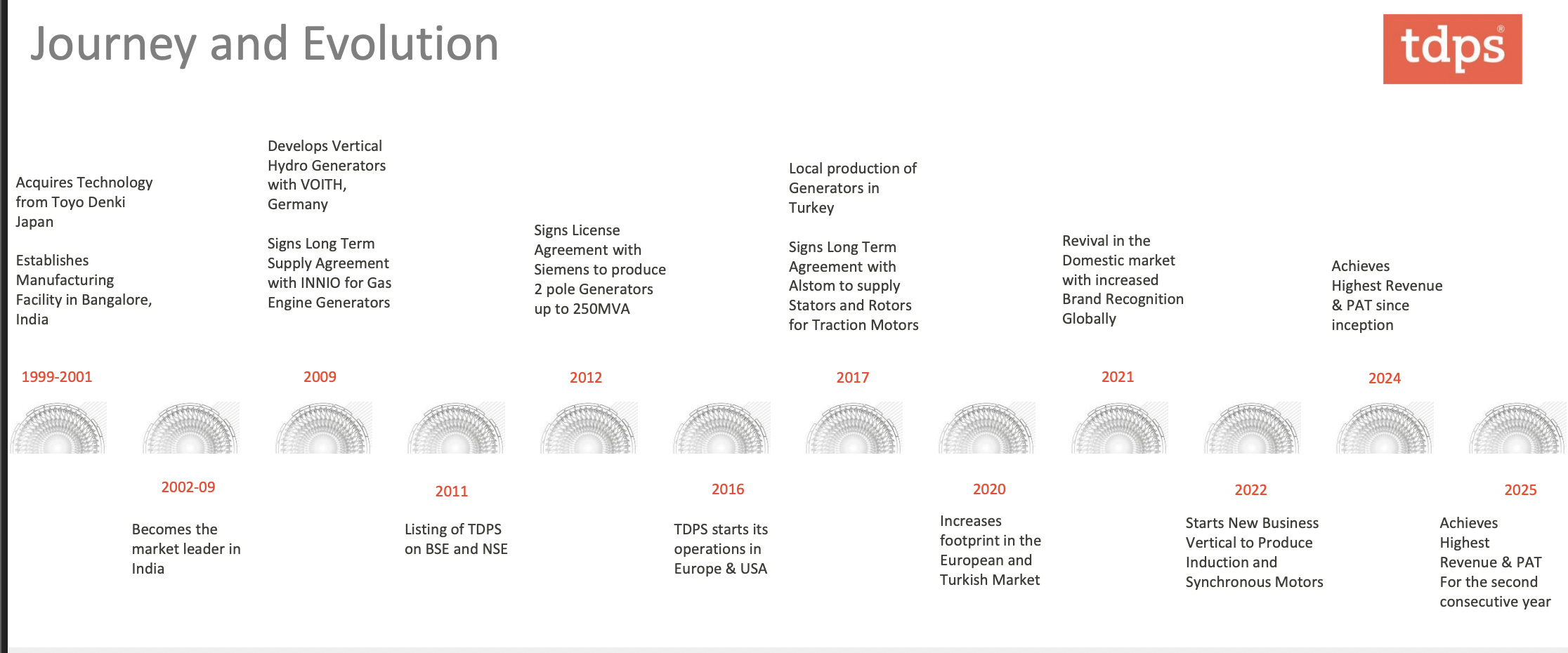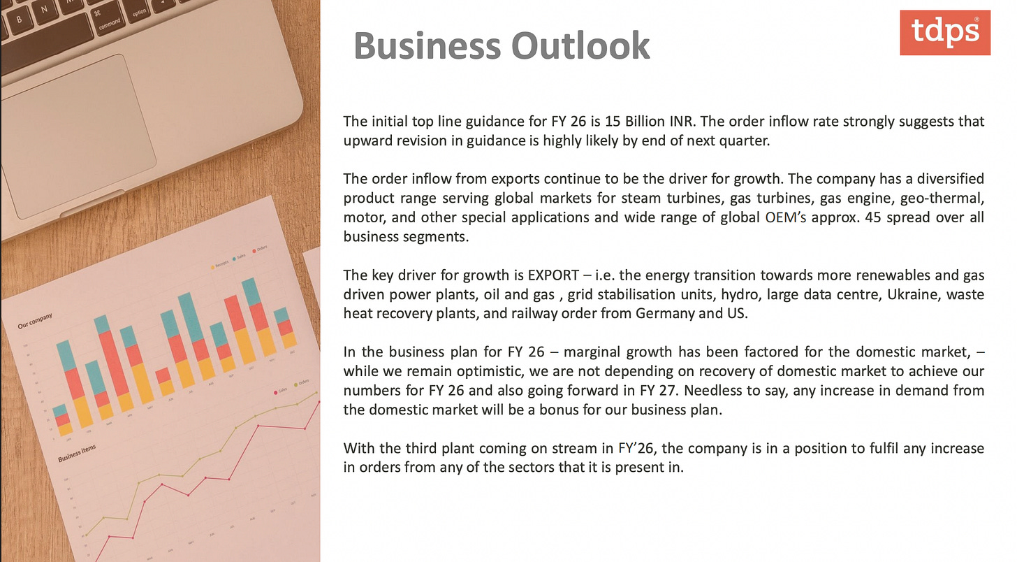 Add to this the macro energy landscape in India: power demand is surging, peaking at 250 GW in FY25. Thermal and gas-based peaking plants are coming back into vogue. Cogeneration in industries like cement, steel, and sugar is growing. Railways are electrifying at scale, and TDPS’s traction motors find strong relevance here too.