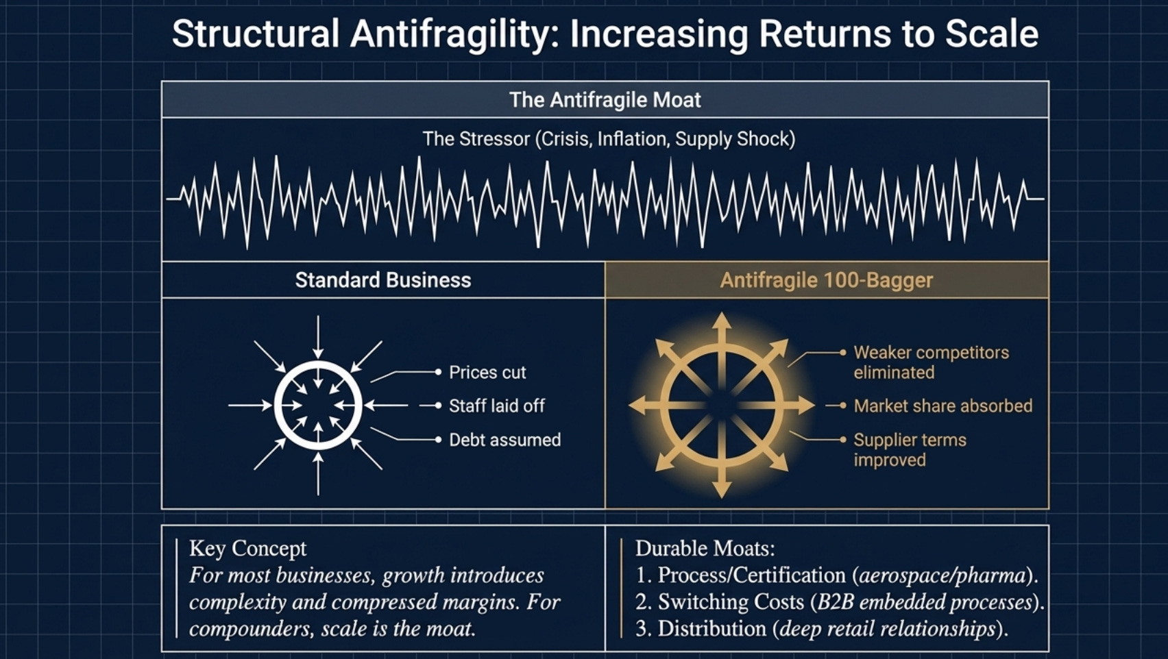 When screening for multi-baggers, pay close attention to how a company behaved in the last significant downturn. Did it cut prices to defend revenue? Lay off core engineering or sales staff? Take on debt to survive? Or did it hold margins, retain key people, and emerge larger? The answer tells you whether you are looking at a fragile business dressed up in a good-looking income statement, or a genuinely antifragile one.