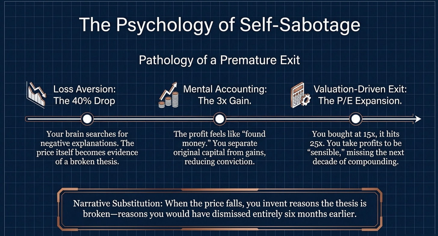 Narrative substitution is perhaps the most insidious. When a stock corrects sharply, your brain automatically searches for a negative explanation. The price itself becomes evidence of a fundamental problem. You start finding reasons the thesis might be broken, reasons you would have dismissed entirely six months earlier when the stock was rising. The price change does not change the fundamentals; it changes the story you tell yourself about the fundamentals. This is the trap.