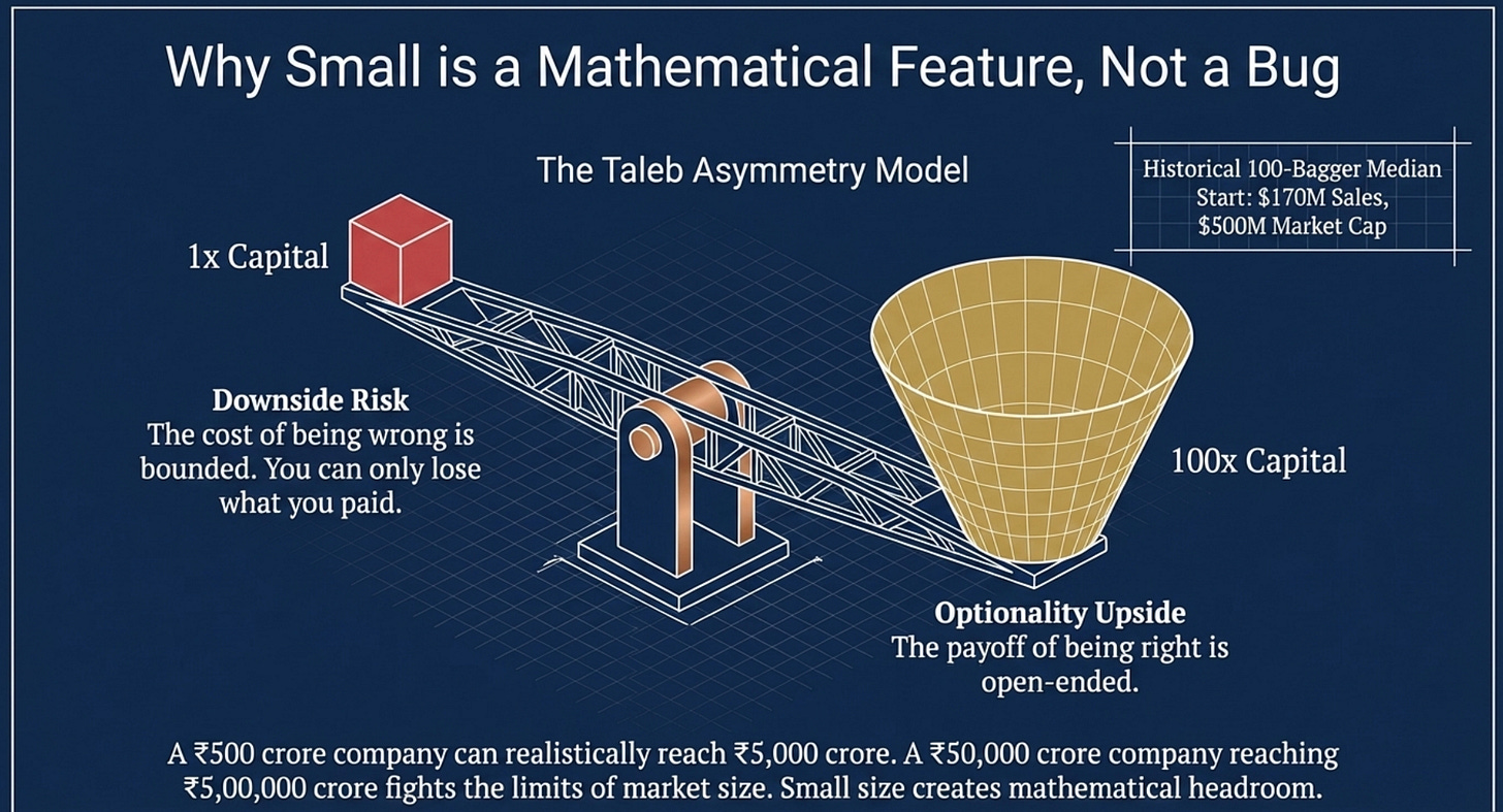 Many small-cap businesses in India have exactly this profile. If you invest in a ₹400 crore market cap business at a sensible valuation and you are wrong, the moat does not hold, management disappoints, the sector headwind is stronger than anticipated, you might lose 40-50% of your capital over several years. That is painful but survivable with sensible position sizing. If you are right, and the business compounds at 25% for fifteen years, your return is 20-25x. The asymmetry is extreme.