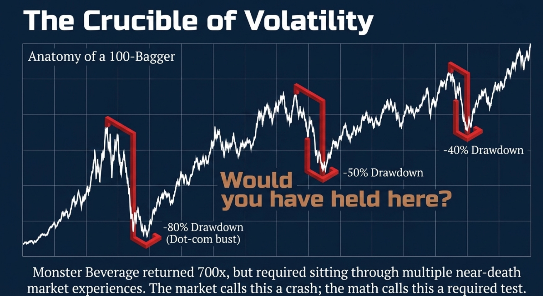 The research on multi-baggers is humbling on this point. Mayer found that many of his 100-bagger stocks corrected 50% or more at least once on the journey to 100x. Many corrected more than once. The investors who captured the full return were not those who timed these corrections perfectly. They were those who held through them.