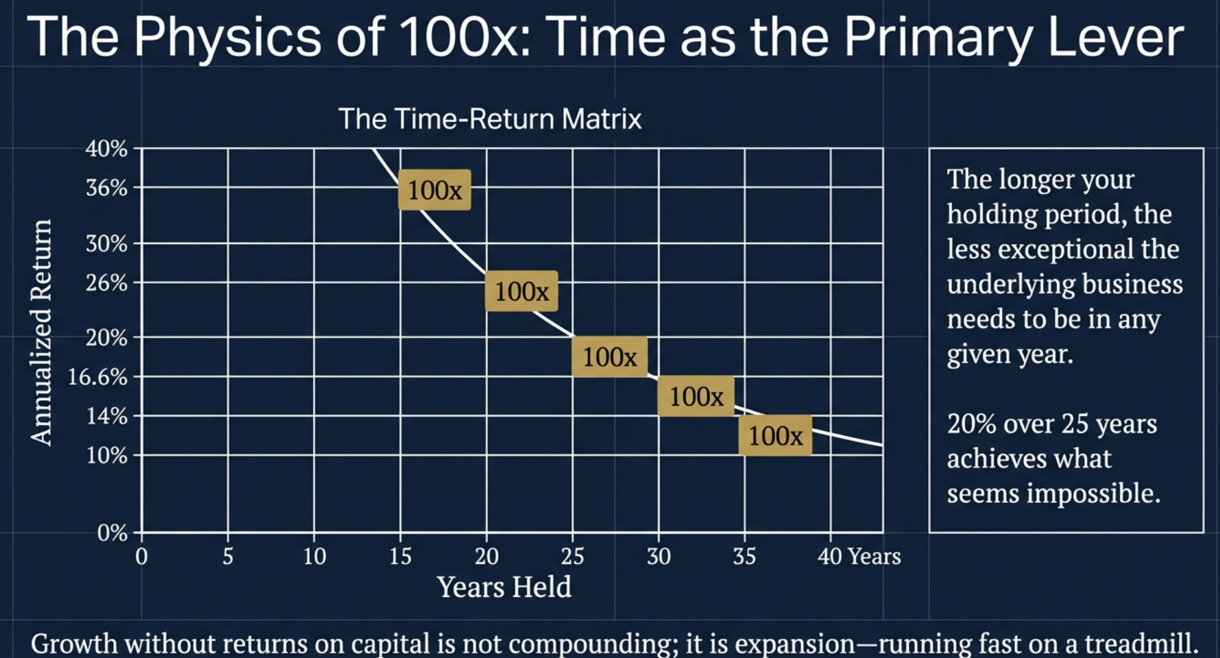 A 10x return over ten years requires a 26% annualised return. Over fifteen years, just 17% per annum. Over twenty years, a mere 12.5%. Time is doing extraordinary amounts of work here, and that is the first and most underappreciated insight: the longer your holding period, the less exceptional the underlying business needs to be in any given year.