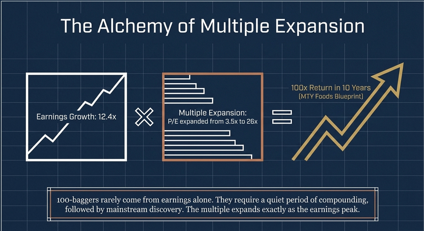 A 10x return in a stock does not come from one source. It comes from two working together: earnings growth and multiple expansion.