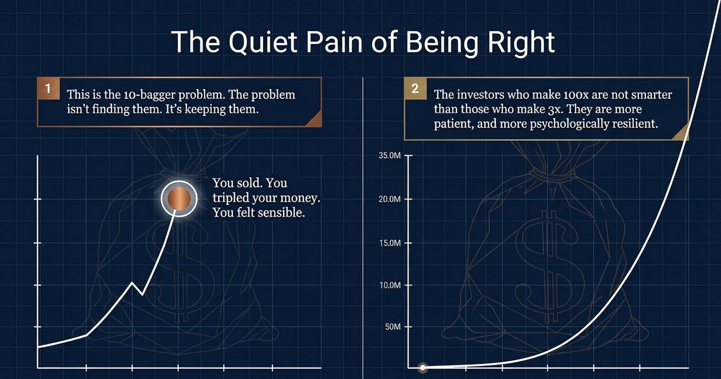 Most investors who hold a 10-bagger do not make 10x. They make 3x. They make 4x. They sell somewhere along the way for entirely rational-sounding reasons: it looks expensive, they need the cash, something else looks more interesting. And they watch the rest of the journey unfold from the sidelines.