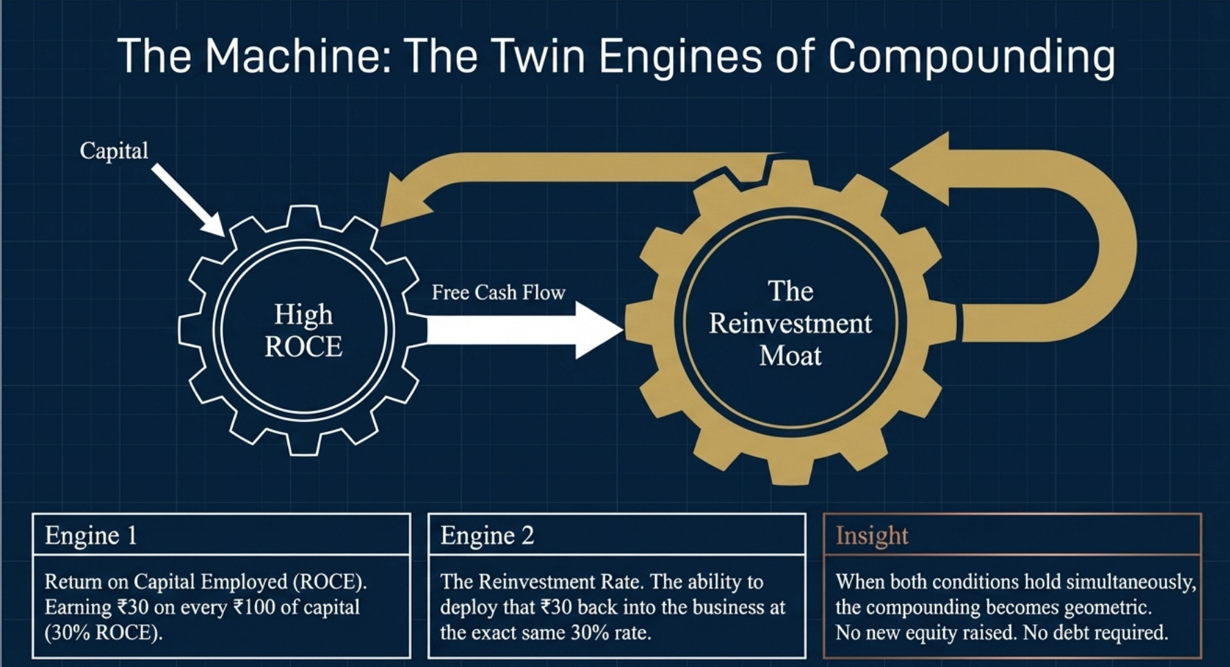 This is the twin-engine framework. The first engine is the ROCE itself: the return the business earns on what it deploys. The second, and deeply underappreciated engine, is the reinvestment rate, meaning what fraction of free cash flow the business can put back into new growth at the same or similar returns.