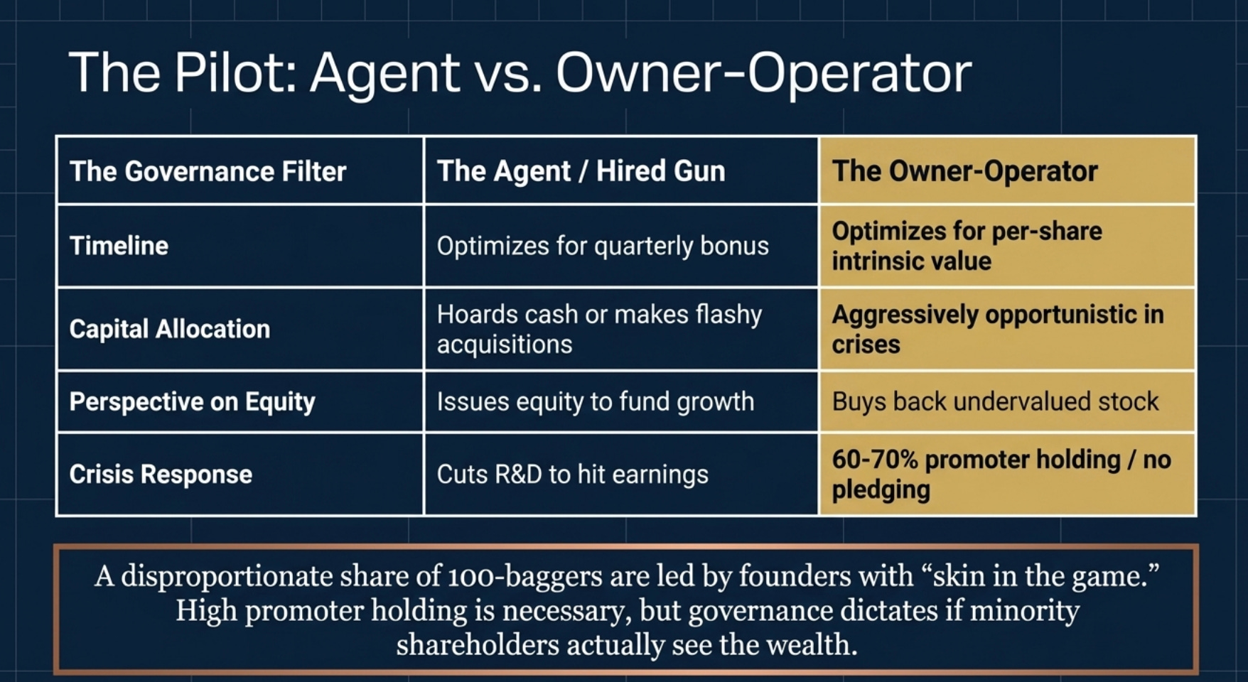 In India, this manifests through the promoter structure. A promoter holding 60-70% of a growing small-cap company, with no pledging, who has been in the role for fifteen years, who took a modest salary even in difficult years, who has reinvested into the business rather than extracting from it; this is the profile you want. Not because promoters are inherently superior managers. They are not. But because the incentive alignment is real in a way that is genuinely difficult to replicate with professional management.
